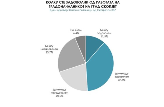 На прашањето колку сте задоволни од работата на градоначалникот на Скопје, половина од испитаниците (49%) одговорија позитивно, а 44,6 отсто се незадоволни, пишува МКД.мк.