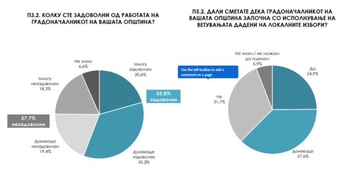 Истражувањето покажува дека за граѓаните на Македонија главно се задоволни од работата на градоначалниците во нивната општина (55,8%) и дека ги исполнуваат ветувањата. Сепак, во сите општини граѓаните сметаат дека најголем проблем е хигиената, на второ место е јавниот превоз, па урбанизацијата, паркингот, кучињата скитници, загадувањето на воздухот…