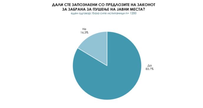 Мнозинството од испитаниците (83,7%) изјавиле дека се запознаени со предлозите на законот за забрана на пушење на јавни места. Од нив 65,5% го поддржуваат овој закон, додека 26,8% не го поддржуваат.